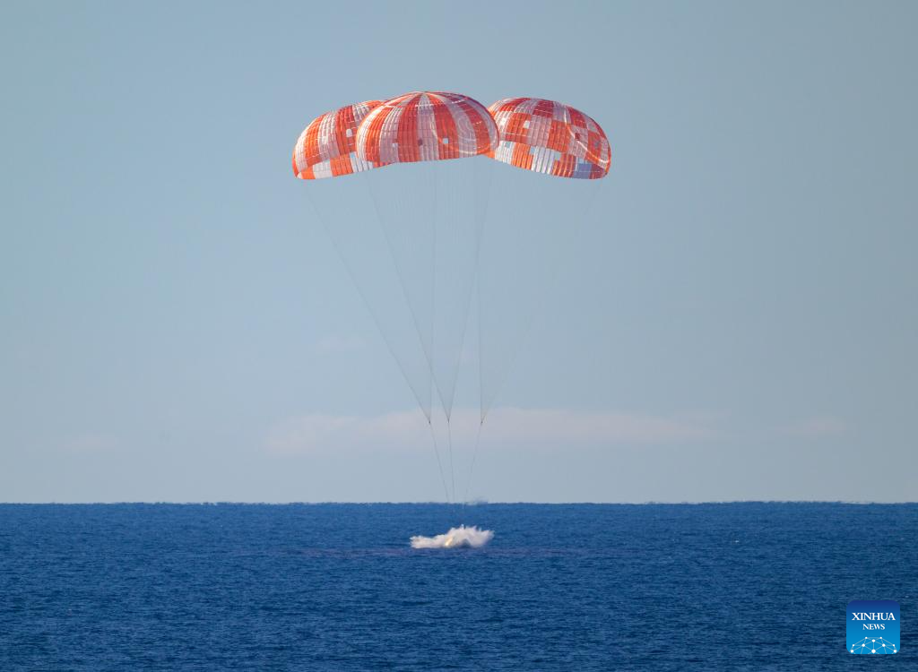 NASA's Orion spacecraft carrying Artemis II crew members is seen as it lands in the Pacific Ocean off the coast of California, the United States, on April 10, 2026. NASA's Artemis II mission splashed down off the coast of San Diego, the U.S. state of California Friday evening. (Bill Ingalls/NASA/Handout via Xinhua)
