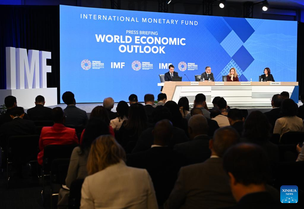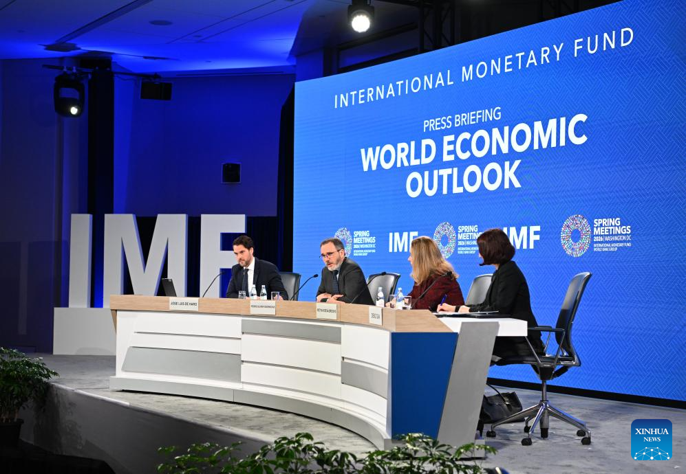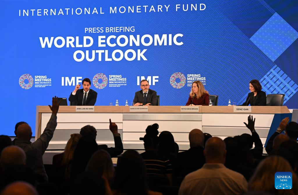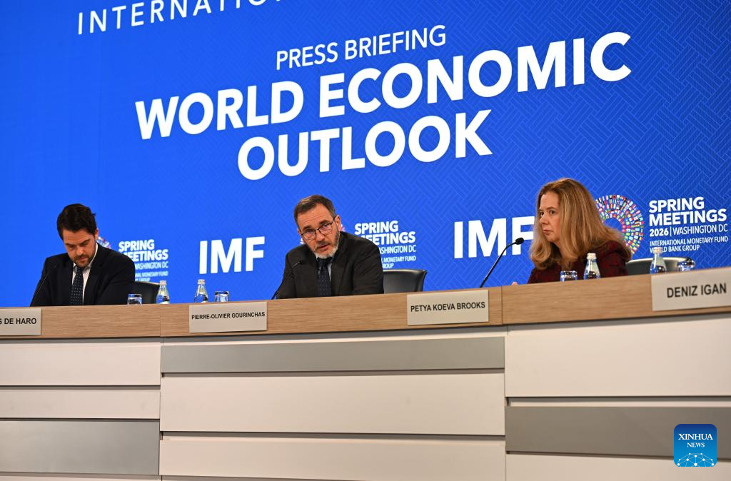 The International Monetary Fund (IMF) chief economist Pierre-Olivier Gourinchas (2nd L) speaks at a press briefing on the latest World Economic Outlook in Washington, D.C., the United States, April 14, 2026. IMF lowered its global economic growth forecasts for 2026 to 3.1 percent in the World Economic Outlook (WEO) report published on Tuesday, while keeping its projection for 2027 at 3.2 percent. (Xinhua/Li Rui)