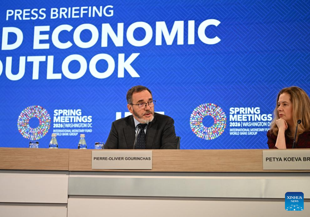 The International Monetary Fund (IMF) chief economist Pierre-Olivier Gourinchas (L) speaks at a press briefing on the latest World Economic Outlook in Washington, D.C., the United States, April 14, 2026. IMF lowered its global economic growth forecasts for 2026 to 3.1 percent in the World Economic Outlook (WEO) report published on Tuesday, while keeping its projection for 2027 at 3.2 percent. (Xinhua/Li Rui)