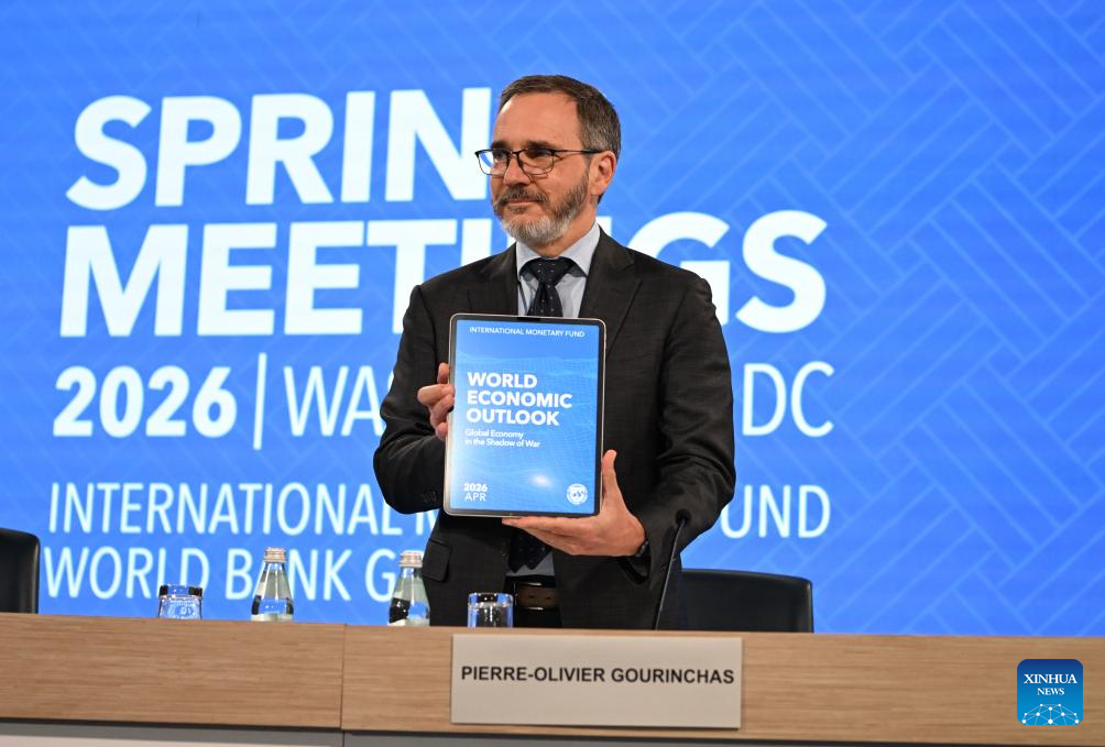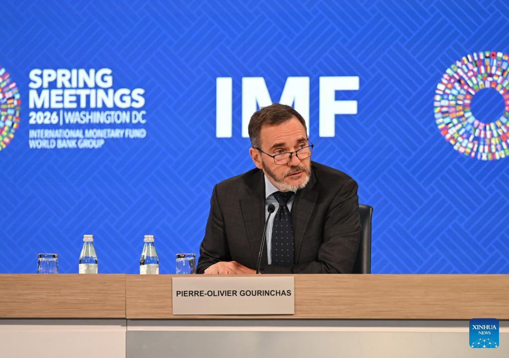 The International Monetary Fund (IMF) chief economist Pierre-Olivier Gourinchas (C) speaks at a press briefing on the latest World Economic Outlook in Washington, D.C., the United States, April 14, 2026. IMF lowered its global economic growth forecasts for 2026 to 3.1 percent in the World Economic Outlook (WEO) report published on Tuesday, while keeping its projection for 2027 at 3.2 percent. (Xinhua/Li Rui)