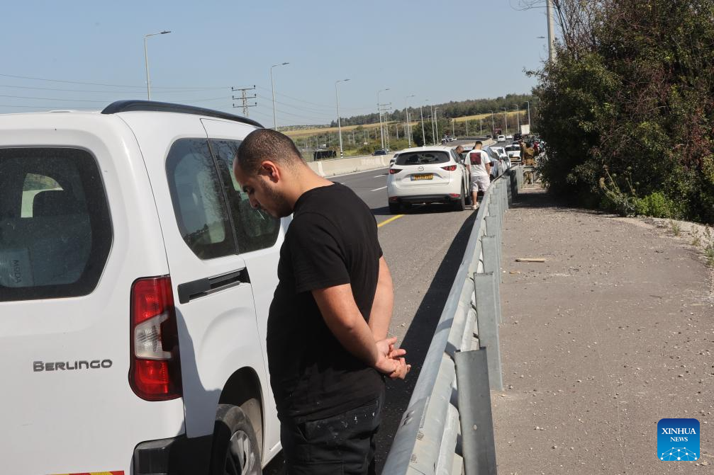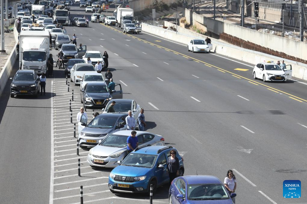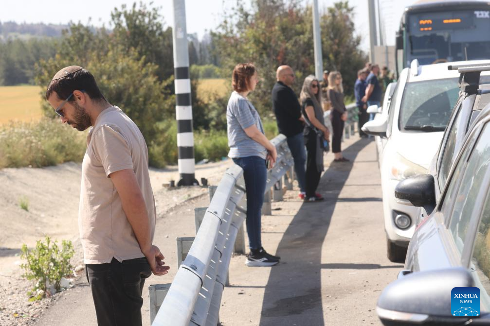People stand in silence as a siren sounds to commemorate Holocaust victims along a highway near Tel Aviv, Israel, on April 14, 2026. Israel on Monday started commemorating its annual Holocaust Martyrs' and Heroes' Remembrance Day with an official torch-lighting ceremony in Jerusalem at the country's Holocaust memorial Yad Vashem. Remembrance activities will continue through Tuesday, featuring a wreath-laying ceremony at Yad Vashem, among others. (Photo by Gil Cohen Magen/Xinhua)
