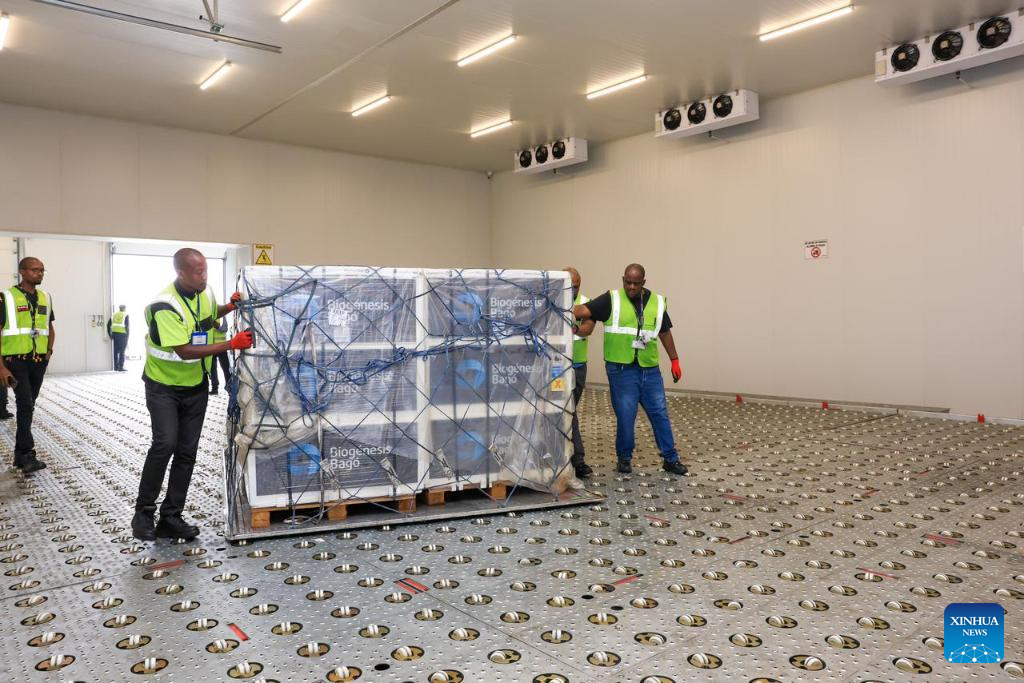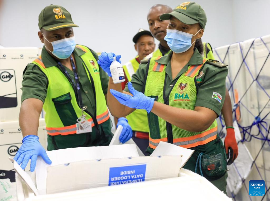 Workers move foot-and-mouth disease (FMD) vaccines in Johannesburg, South Africa, Feb. 21, 2026. South Africa on Saturday received one million doses of high-potency FMD vaccines as part of efforts to curb recurring outbreaks, the Department of Agriculture said. (GCIS/Handout via Xinhua)