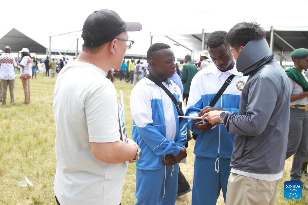 Zimbabwean youths inquire about job opportunities from staff members of a Chinese company during a job fair in Marondera District of Mashonaland East Province, Zimbabwe, on Feb. 21, 2026. As the job market remains competitive for fresh graduates, young Zimbabweans have expressed a growing interest in seeking career opportunities at Chinese firms, which have become a major source of employment in the southern African country. (Photo by Tafara Mugwara/Xinhua)