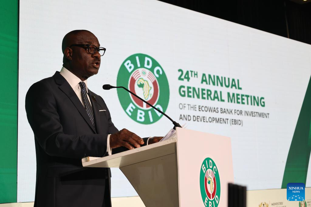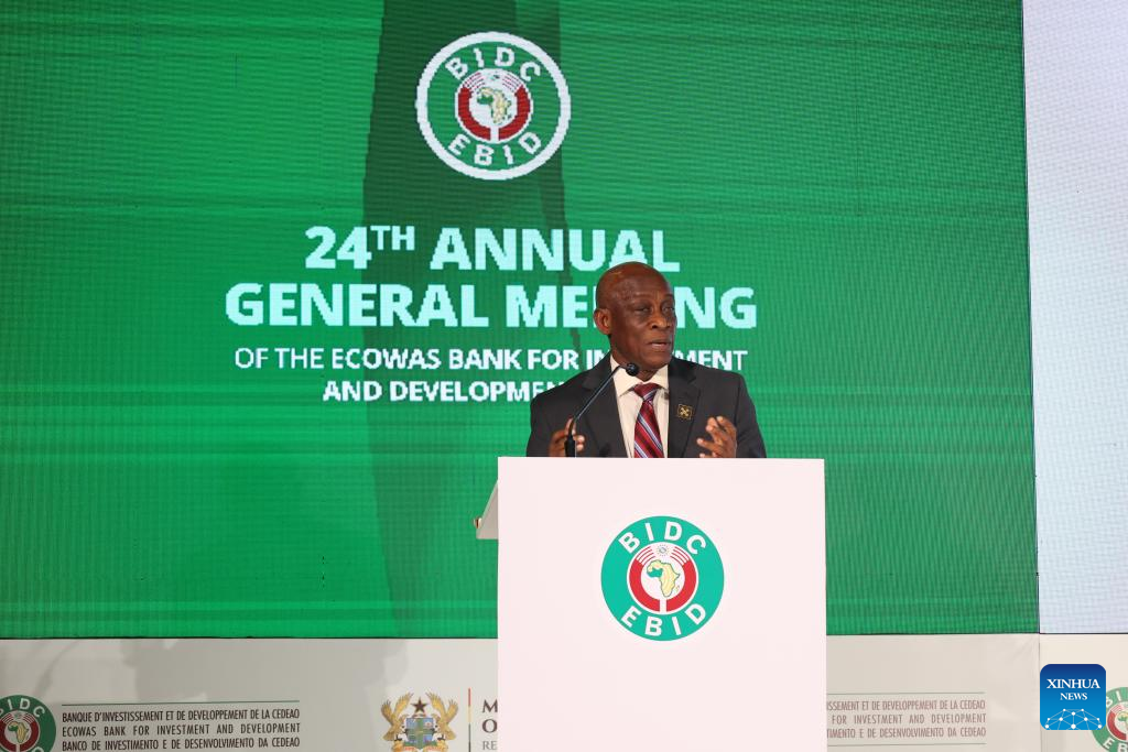 George Agyekum Donkor, president of the ECOWAS Bank for Investment and Development (EBID), speaks at the 24th Annual General Meeting of the EBID in Accra, Ghana, April 8, 2026. (Photo by Seth/Xinhua)