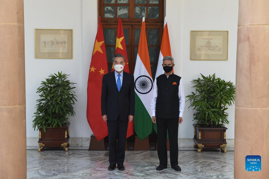 Visiting Chinese State Councilor and Foreign Minister Wang Yi (L) talks with Indian External Affairs Minister Subrahmanyam Jaishankar in New Delhi, India, March 25, 2022. (Xinhua/Zhao Xu)