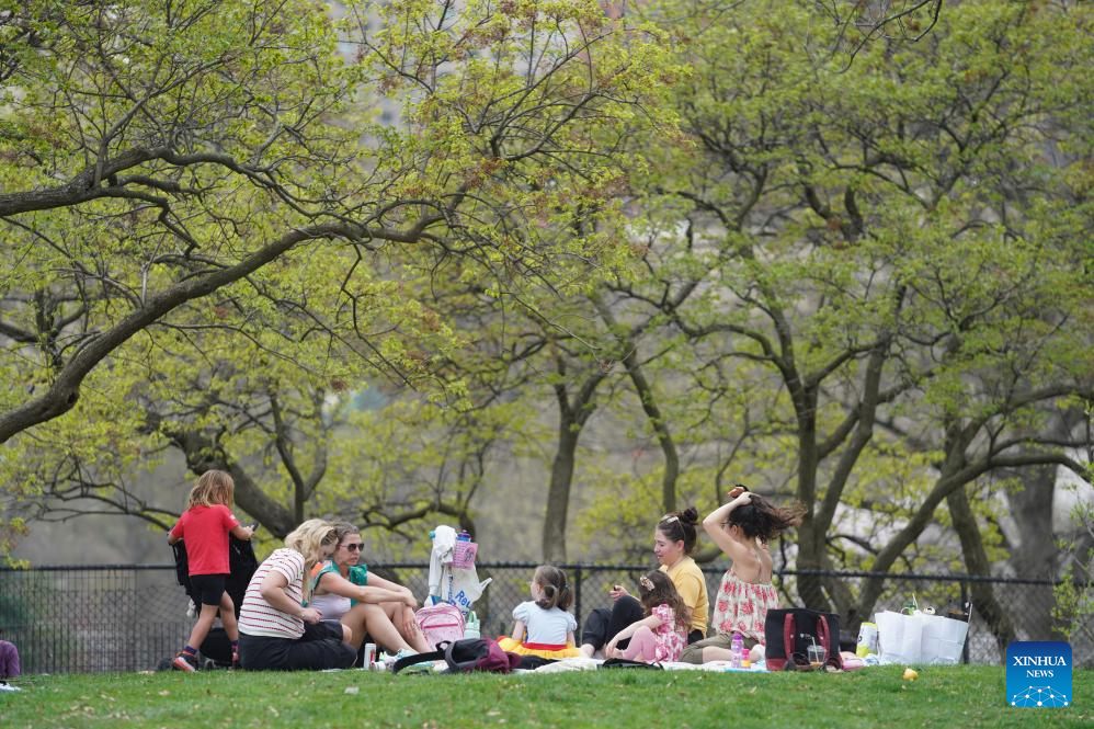 People sit under trees at the Central Park in New York, the United States, on April 1, 2026. (Xinhua/Zhang Fengguo)