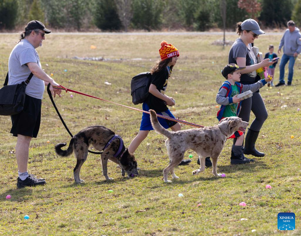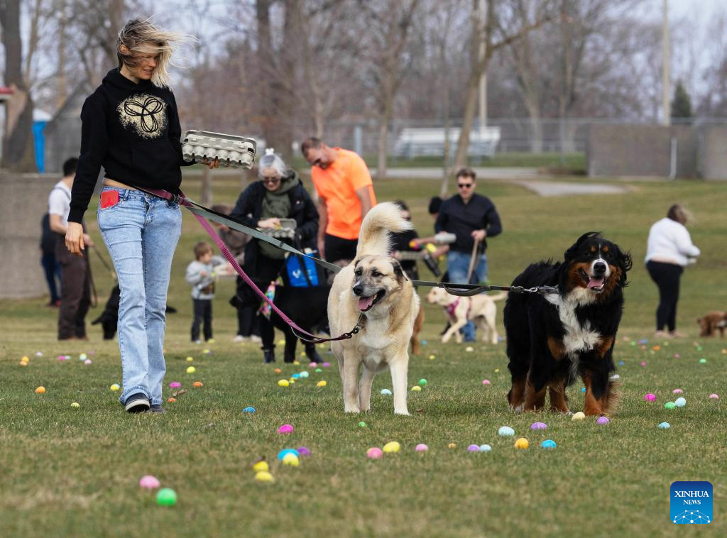 Participants and pet dogs collect eggs during the 2026 Easter Egg Hunt for Dogs in Hamilton, Ontario, Canada, on April 3, 2026. About 300 participants and their pet dogs took part in this annual traditional event here on Friday to celebrate Easter. (Photo by Zou Zheng/Xinhua)