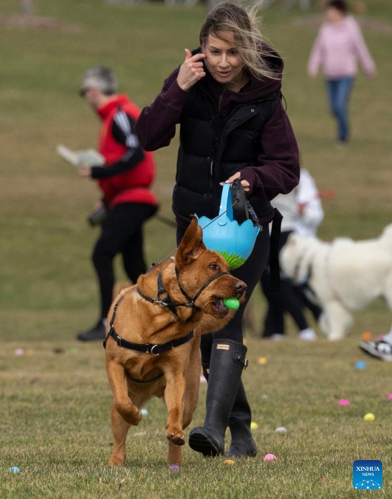 A pet dog collects eggs during the 2026 Easter Egg Hunt for Dogs in Hamilton, Ontario, Canada, on April 3, 2026. About 300 participants and their pet dogs took part in this annual traditional event here on Friday to celebrate Easter. (Photo by Zou Zheng/Xinhua)
