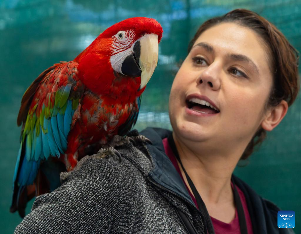 A woman interacts with a macaw at the 2026 Spring Canadian Pet Expo in Mississauga, Ontario, Canada, on April 3, 2026. Featuring a pet marketplace, pet competitions and more, this three-day event kicked off here on Friday and will last until Sunday. (Photo by Zou Zheng/Xinhua)