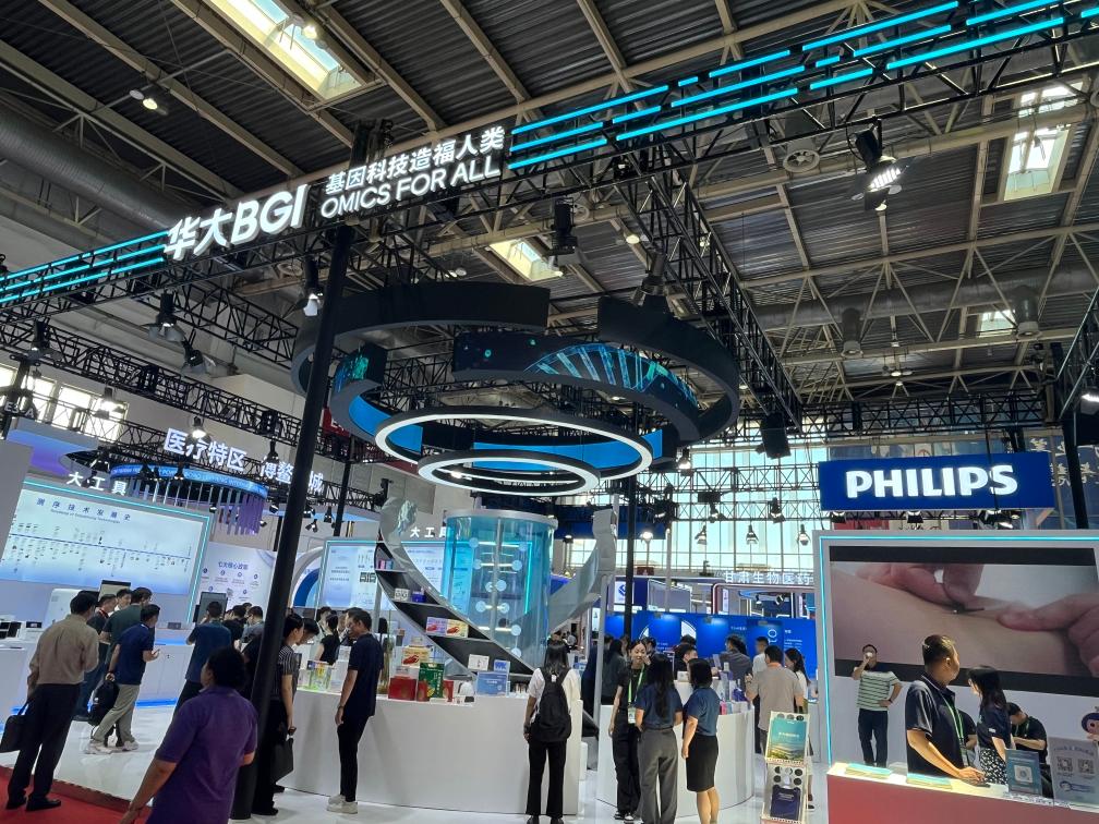 在华大集团展台,一款饮酒能力基因测序仪吸引参展观众围观体验。