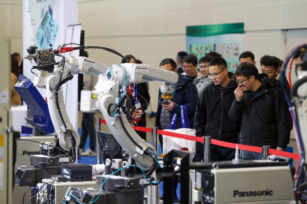3月18日,观众在天津工博会上参观一款打磨工作站。