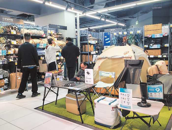 图为消费者在北京的迪卡侬门店选购户外露营装备。