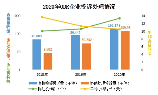 2020年,市場監(jiān)管部門大力推進(jìn)在線糾紛和解機(jī)制建設(shè),努力把消費(fèi)糾紛化解在源頭、解決在基層、和解在企業(yè)。全國12315平臺共發(fā)展ODR企業(yè)2.55萬家,主動與消費(fèi)者協(xié)商糾紛19.22萬件,與傳統(tǒng)調(diào)解方式相比,和解率高出6.21個百分點(diǎn),平均處理時長縮短7.76天,消費(fèi)者滿意度4.07分(滿分5分),ODR城市覆蓋率由25.60%增加到91.11%。與2019年相比,2020年ODR機(jī)制運(yùn)行質(zhì)量有了明顯提高,投訴處理量、辦理效率、和解成功率、消費(fèi)者滿意度等各方面均有明顯提升,維權(quán)效能日益突顯。