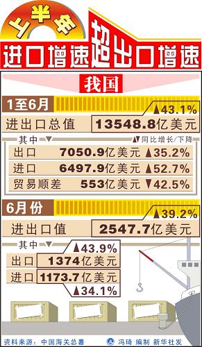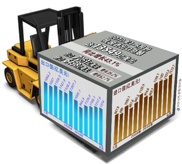 圖表:2010年1-6月份我國(guó)進(jìn)出口總額達(dá)13549億美元