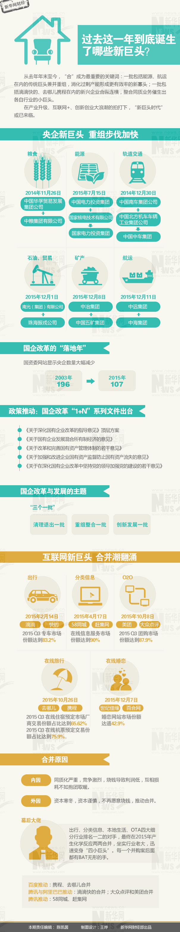 一批包括能源、航運(yùn)在內(nèi)的傳統(tǒng)巨頭兼并重組,力求消化過剩產(chǎn)能以成為更有效率的領(lǐng)軍者;一批包括滴滴快的、去哪兒攜程在內(nèi)的新興企業(yè)合縱連橫,整合同質(zhì)業(yè)務(wù)催生出各自行業(yè)的小巨頭。