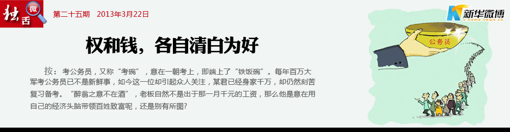 如果千萬富翁考上公務(wù)員 千萬富翁考公務(wù)員折射的是某些政府部門“門難進、事難辦”的現(xiàn)狀,也反映出當下企業(yè)的生存無奈。假設(shè)他有朝中舉,好的結(jié)果是政府吸納了一名懂經(jīng)濟的得力干將,壞的結(jié)果則是又多出一個亦官亦商的“紅頂商人”。