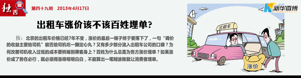 一粬:需考慮全國(guó)人民的感受 反對(duì)出粗車漲價(jià),北京出租車漲價(jià)的理由居然是根據(jù)北京居民和工薪階層工資上漲幅度為理由,確實(shí)是特權(quán)利益階層短視經(jīng)不起推敲的謬見(jiàn),北京是全體國(guó)家公民一生中最少去一次的城市,所有窗口行業(yè)的收費(fèi)確實(shí)不只是一個(gè)城市的小事情,須思考全國(guó)人民的感受。