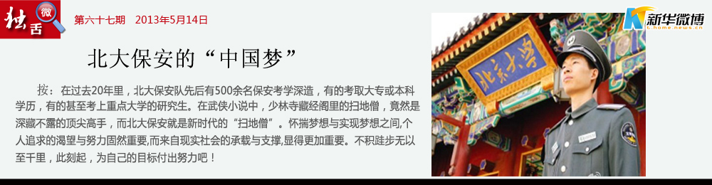 知識改變命運 中國夢是中國人的夢,而在出彩機會上,每個人都會有自己的價值標(biāo)桿。北大保安們,大都是“有組織有目的”的投身北大,其實這本來就是種奮斗過程。