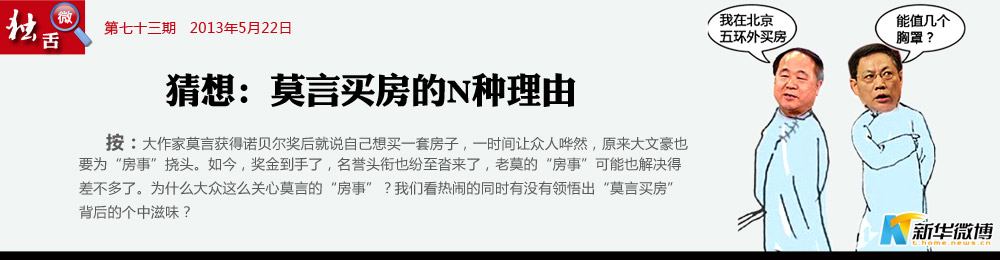 猜想四:生活方便才能工作方便 獲得諾獎(jiǎng)了,拿到獎(jiǎng)金了;當(dāng)上主任了,有了編制了;演講變多了,交際頻繁了……為了以后工作便利,支持莫言老師在宇宙中心購房,希望莫言老師再創(chuàng)佳績。