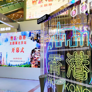此次主題展展臺外觀通透明亮,內部搭配錯落有致的霓虹招牌,還呈現(xiàn)香港古跡和香港街道的場景,讓觀眾身在北京也能感受到香港豐富多元的都巿面貌,體驗濃厚的“港風”。展覽分為六大主題,包括“香港連接內地與世界的橋梁功能”“商貿金融和創(chuàng)新科技”“多元文藝發(fā)展”“薈萃古今中外文化的特色”“綠色城市風光”“京港合作交流”。展臺還設有兩個互動裝置,以富有趣味的方式讓參觀者“連系”香港,并為香港送上祝福。
