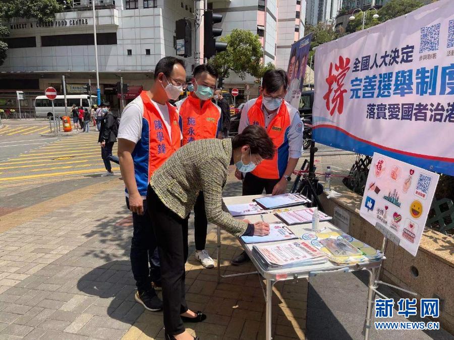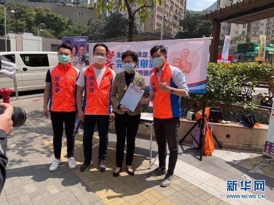 新華社香港3月15日電(記者劉明洋)連日來(lái),“香港各界撐全國(guó)人大決定完善選舉制度連線”在全港各區(qū)擺設(shè)街站,收集市民支持全國(guó)人大決定的簽名。香港特區(qū)行政長(zhǎng)官林鄭月娥15日前往位于港鐵堅(jiān)尼地城站的街站簽名,支持落實(shí)“愛(ài)國(guó)者治港”原則,并為街站工作人員打氣加油。