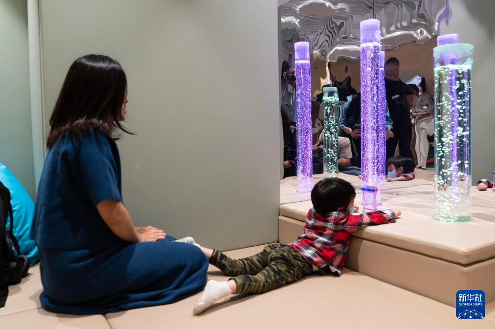 在位于香港国际机场一号客运大楼的“感知阁”内,邓女士陪伴被诊断为孤独症的儿子玩耍(3月31日摄)。 新华社发(龙镜伊 摄)