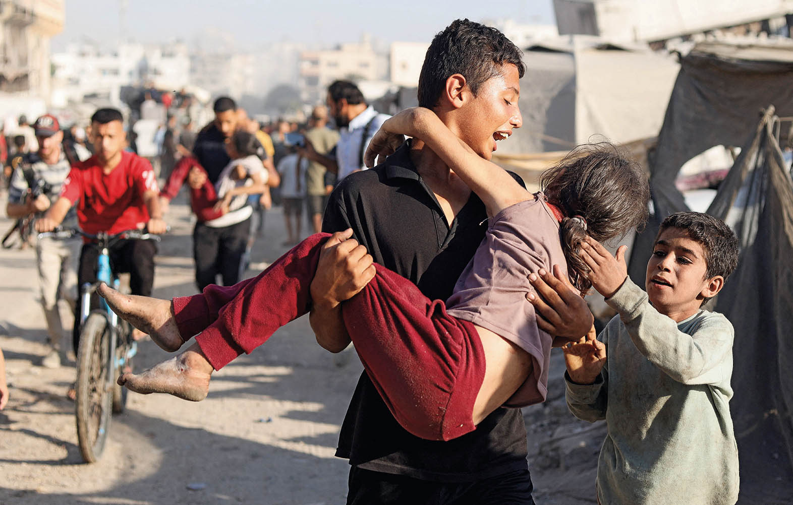 9 月 7 日,在加沙城中的一座流离失所者临时营地,一名男孩怀抱一名受伤的女孩
