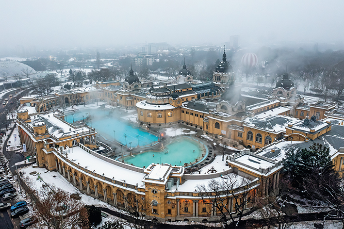 2026年1月16日在匈牙利布达佩斯拍摄的雪后塞切尼温泉(无人机照片)。近日,匈牙利布达佩斯连续遭遇大雪、冻雨天气,整个城市被冰雪覆盖