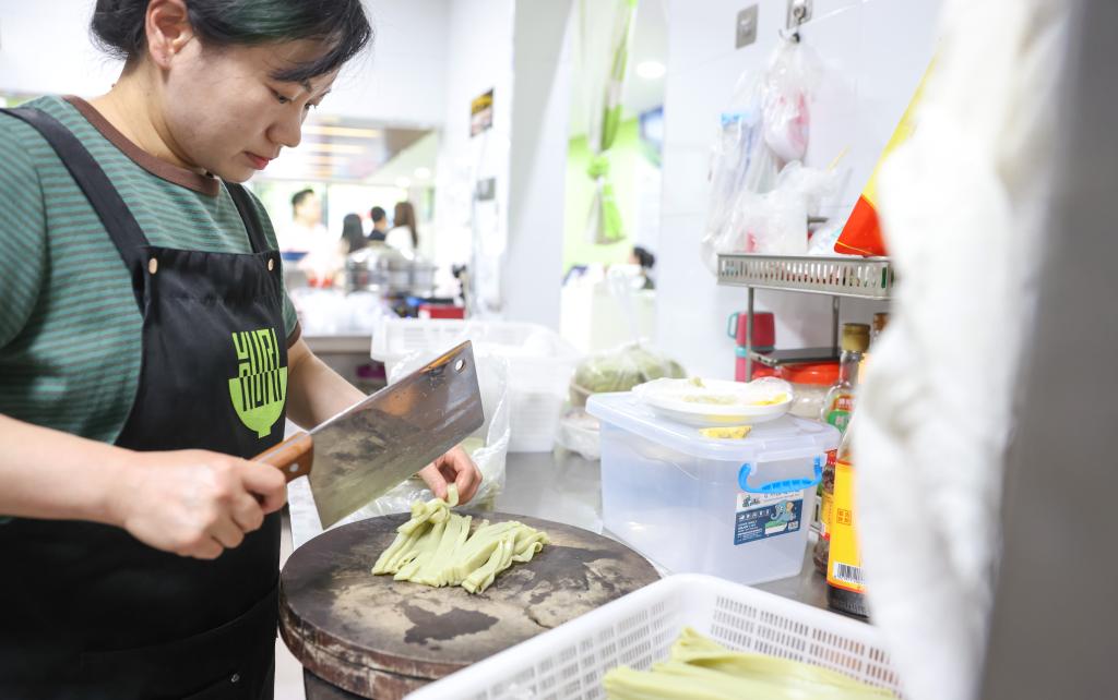 5月14日,工作人员在贵州省江口县一家抹茶食品餐厅内制作抹茶面皮。
