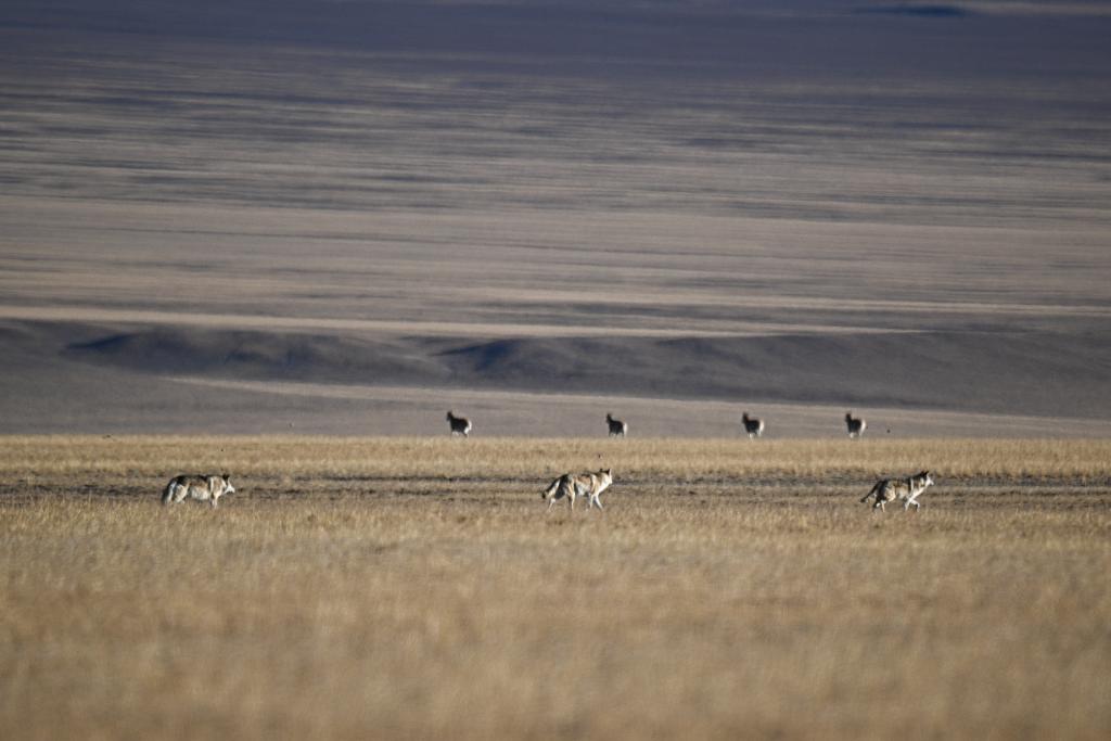 在阿尔金山国家级自然保护区,狼群准备围猎藏羚羊(12月7日摄)。