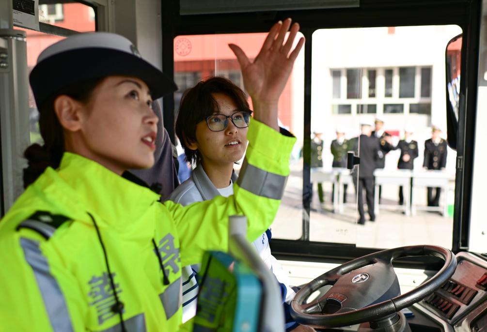3月30日,在乌鲁木齐市第一中学(高新校区),乌鲁木齐市公安局交通管理支队民警(左)为学生讲解公交车驾驶员视线盲区。