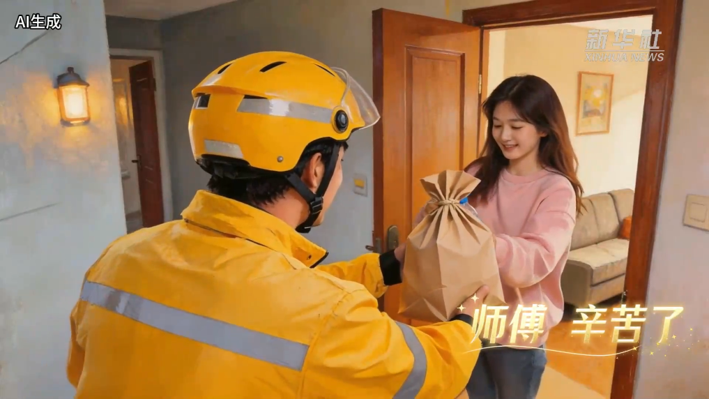 外卖小哥冒雨骑行送餐,顾客递上矿泉水不忘暖心叮嘱