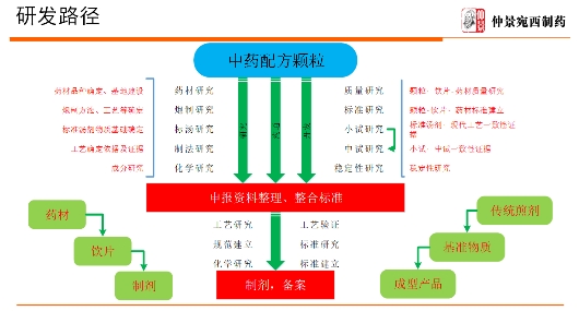中藥配方顆粒的研制路線是從產(chǎn)品研制開始,要經(jīng)過(guò)標(biāo)準(zhǔn)復(fù)核、現(xiàn)場(chǎng)檢查、專家評(píng)審等環(huán)節(jié),最終需獲得藥監(jiān)管理部門的備案許可。研制路徑的重點(diǎn)主要是前期大量文獻(xiàn)的調(diào)研、過(guò)程中質(zhì)量控制的一致性研究和工藝的穩(wěn)定性、有效性再評(píng)價(jià)等,對(duì)企業(yè)的研發(fā)、人才及經(jīng)濟(jì)方面的投入要求非常高。