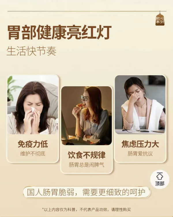 固本堂官方旗舰店在提到胃部不适场景时,在下方以小号字体提示“以上内容仅为科普,不代表产品功效,请理性购买”。店铺截图