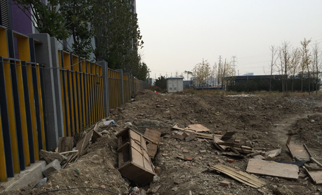 由于項目后期還在建設(shè)中,透過小區(qū)東邊未被圍擋遮擋處,記者觀察到黃土裸露、垃圾遍地,一陣風后吹起塵土,讓人踹不上氣來。