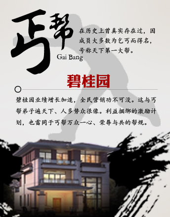 碧桂園 丐幫 丐幫因成員大多數(shù)為乞丐而得名,號(hào)稱天下第一大幫。 碧桂園是今年房企風(fēng)頭最勁的一匹黑馬。和丐幫人多勢(shì)眾一樣,全民營銷,其躋身千億軍團(tuán)的最大功臣。