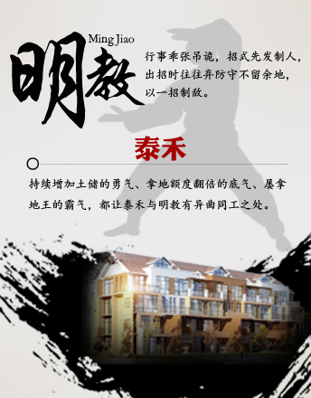 泰禾 明教 明教行事乖張吊詭,被各大名門正派視為異端。 泰禾幾乎就是業(yè)內(nèi)土豪的代名詞,其花錢如流水的瘋狂拿地法、、屢屢直面地王的霸氣,都讓它與明教有異曲同工之處。