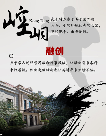 融創(chuàng) 崆峒派 崆峒武術(shù)特點(diǎn)在于奇兵,外形各異、攜帶方便, 往往暗藏于袖筒和靴筒中,交手中往往突然出擊取勝。今年頻頻拿地,其異于常人的經(jīng)營思路,讓孫宏斌招致各種爭(zhēng)議和質(zhì)疑。