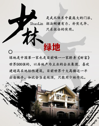 綠地 少林派 少林是體系最龐大的門派,招法剛健有力、攻防兼?zhèn)?、樸?shí)無華。 綠地是中國首家躋身《財(cái)富》世界500強(qiáng)的,以房產(chǎn)為主業(yè)的企業(yè)。項(xiàng)目遍及全國,世界十大高樓近一半來自綠地。