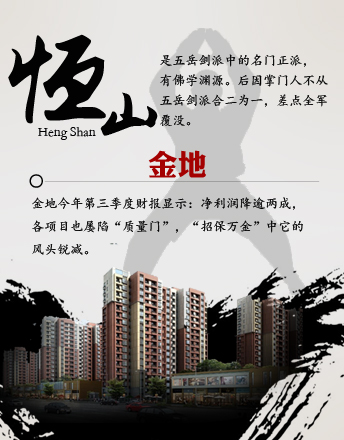 金地 恒山派 原是五岳劍派中的名門正派,有佛學(xué)淵源。后差點(diǎn)全軍覆沒。 金地過去為業(yè)界四大天王之一。但其今年第三季度財(cái)報(bào)顯示:凈利潤降逾兩成,各項(xiàng)目屢陷質(zhì)量門,天王冠冕也不保。