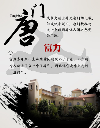 富力 唐門 唐門用毒之名,天下皆知。 富力擁有一級(jí)開發(fā)資質(zhì),卻總是遭業(yè)主維權(quán)。因壓縮成本、過快擴(kuò)張導(dǎo)致的質(zhì)量問題一再曝光。讓購房人后悔不迭,因此說富力是房企內(nèi)的“唐門”。