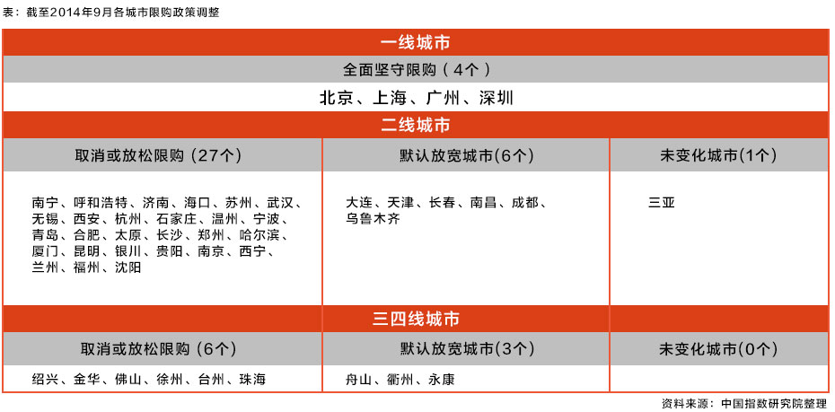 全國僅五個城市未放松限購。繼4月南寧定向調(diào)整、6月呼和浩特正式發(fā)文取消限購,進入三季度后限購調(diào)整呈現(xiàn)多米諾效應(yīng),多個城市陸續(xù)放寬。截至9月末,全國47個限購城市中,共有42個城市有所放寬,僅北京、上海、廣州、深圳、三亞個城市未做調(diào)整。