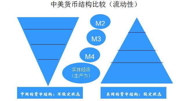 從M3或更多的貨幣層次考察,情況完全不同。美國(guó)的M3達(dá)到400多萬億人民幣,是中國(guó)的3倍,日本達(dá)300多萬億人民幣,是中國(guó)的2倍。從M3以上的層次考察,美國(guó)的貨幣供給更多。中國(guó)的貨幣問題不是數(shù)量問題,主要是結(jié)構(gòu)和效率問題?!暗谷切巍钡呢泿沤Y(jié)構(gòu)表明中國(guó)金融體系不穩(wěn)定,較易發(fā)生金融動(dòng)蕩和風(fēng)險(xiǎn),中國(guó)貨幣層次中,M3以下逐步減少,越距實(shí)體經(jīng)濟(jì)貨幣越少,金融對(duì)實(shí)體經(jīng)濟(jì)的支持小。大量貨幣呈現(xiàn)高流動(dòng)性,容易引發(fā)通脹。金融資源配置效率低下,資金的信息化程度低,有效產(chǎn)出率不高。美國(guó)貨幣結(jié)構(gòu)特征是,貨幣的基礎(chǔ)層次龐大,接近實(shí)體經(jīng)濟(jì)的貨幣供給充分,金融市場(chǎng)效率高;M3、M4等吸納貨幣功能強(qiáng),有利于治理通貨膨脹,美國(guó)的貨幣層次甚至延伸到全球,為美國(guó)治理通脹提供了充分的工具。