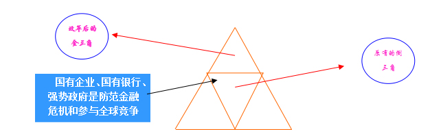 在當(dāng)前情況下,中國(guó)的金融、經(jīng)濟(jì)和政府都是一種“倒三角”的結(jié)構(gòu),如圖中的白色部分。這種結(jié)構(gòu)不穩(wěn)定,風(fēng)險(xiǎn)較大,不利于經(jīng)濟(jì)結(jié)構(gòu)的調(diào)整和經(jīng)濟(jì)的可持續(xù)發(fā)展。金融業(yè)表現(xiàn)為銀行過大,直接融資發(fā)展嚴(yán)重滯后,金融資源向國(guó)有企業(yè)和政府集中,中小企業(yè)和民營(yíng)企業(yè)融資非常困難。經(jīng)濟(jì)結(jié)構(gòu)的倒三角表現(xiàn)為近幾年,國(guó)進(jìn)民退,央企、國(guó)企很大,而民營(yíng)企業(yè)和中小企業(yè)萎縮。政府結(jié)構(gòu)表現(xiàn)為上強(qiáng)下弱,權(quán)力大服務(wù)小,人治大,法治小。有人建議推倒重來,這是不可以的,要吸取前蘇聯(lián)亡黨亡國(guó)的教訓(xùn)。應(yīng)當(dāng)繼續(xù)漸進(jìn)的增量改革,做強(qiáng)做好國(guó)有股份制銀行,大力發(fā)展資本市場(chǎng)和金融市場(chǎng),形成金三角的金融結(jié)構(gòu)。經(jīng)濟(jì)方面做好國(guó)有企業(yè),大力發(fā)展民營(yíng)企業(yè)與中小企業(yè)。政府方面要提高效率,形成高效政府和大服務(wù)的組合、依法治國(guó)與以德治國(guó)的有機(jī)結(jié)合。國(guó)有企業(yè)、國(guó)有銀行、強(qiáng)勢(shì)政府是防范金融危機(jī)和參與全球競(jìng)爭(zhēng)的保障和核心競(jìng)爭(zhēng)力。
