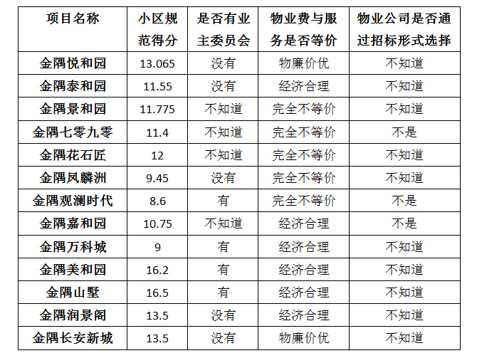 由上圖顯示,在目前的物業(yè)服務(wù)調(diào)查過程中,,有金隅項(xiàng)目得分最高,為28.5分,金隅觀瀾時(shí)代得分最低,為12分。