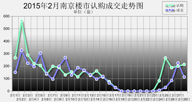 2月的南京樓市整體來看并無太大起伏,多數(shù)開發(fā)商坦言已經(jīng)開始收回年前部分優(yōu)惠,接下來將全力沖刺“金三銀四”。 新華房產(chǎn)記者統(tǒng)計發(fā)現(xiàn),2015年價環(huán)比微漲0.12%。截止到2月28日,南京網(wǎng)上房地產(chǎn)數(shù)據(jù)顯示,2月南京樓市新房認(rèn)購4094套、成交3295套,日均賣房146套。環(huán)比上月認(rèn)購量下跌4成,成交量下跌近5成。