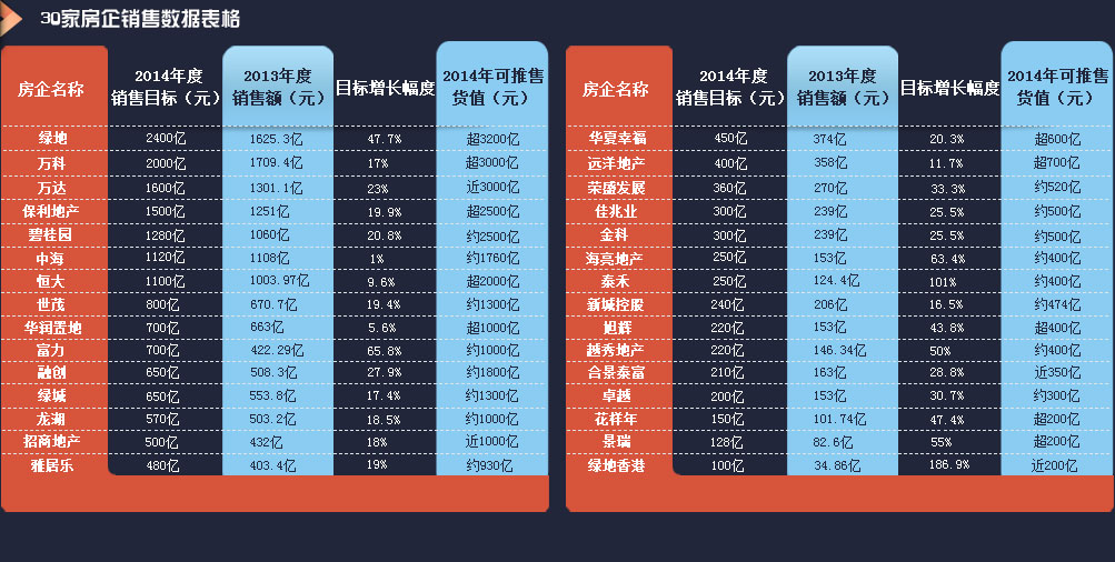 | 近日,多家上市房企陸續(xù)發(fā)布了2013年的年報(bào),對(duì)于2014年的業(yè)績(jī)目標(biāo)以及市場(chǎng)走勢(shì),各家房企有著不同的解讀。萬科作為行業(yè)翹楚,其2000億元的年度銷售目標(biāo)相對(duì)保守; 萬達(dá)、綠地均為2400億元的目標(biāo)則是超越萬科,來勢(shì)兇猛;而碧桂園、融創(chuàng)、佳兆業(yè)、旭輝等公司則大幅提高了今年的銷售目標(biāo)。在年初部分城市樓市陷入低潮之時(shí),顯然開發(fā)商對(duì)2014年全年的市場(chǎng)環(huán)境相對(duì)看好。穆迪投資者服務(wù)公司則指出,中國房企銷售增長在2013年中已開始呈現(xiàn)放緩跡象,預(yù)計(jì)中國房地產(chǎn)開發(fā)商的合約銷售增長,將由去年的26.6%大幅放緩至今年的10%左右。 | ||