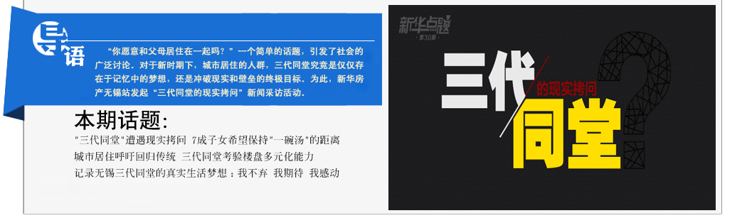 對(duì)于新時(shí)期下,城市居住的人群,三代同堂究竟是僅僅存在于記憶中的夢(mèng)想,還是沖破現(xiàn)實(shí)和壁壘的終極目標(biāo)。為此,新華房產(chǎn)無錫站發(fā)起“三代同堂的現(xiàn)實(shí)拷問”新聞采訪活動(dòng),走訪蠡園街道12個(gè)社區(qū)50組家庭,用一個(gè)個(gè)鮮明的生動(dòng)故事和生活感悟,詮釋中國式家庭居住方式“三代同堂”的不同看法。