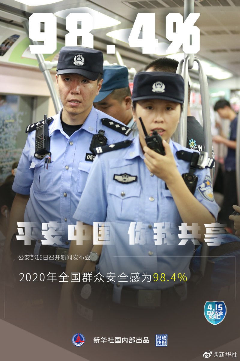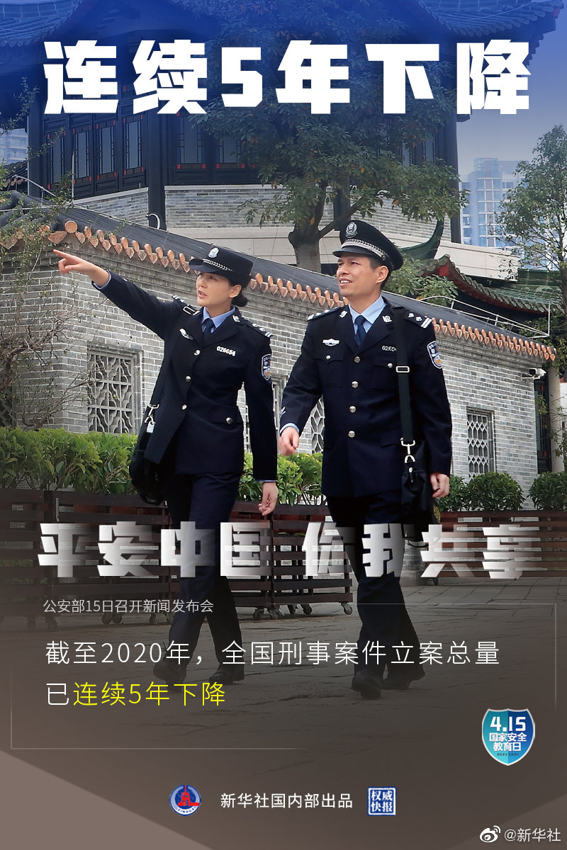 4月15日是第六個全民國家安全教育日,公安部15日召開新聞發(fā)布會介紹:2020年全國群眾安全感為98.4%,全國居民對社會治安滿意度達(dá)83.6%。截至2020年,全國刑事案件立案總量連續(xù)5年下降,八類主要刑事案件數(shù)和查處治安案件數(shù)連續(xù)6年下降。(記者熊豐,海報(bào)設(shè)計(jì)張晨光)
