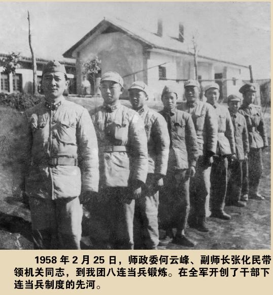 ????1958年8月,毛澤東主席在北戴河召開的中央政治局?jǐn)U大會議上講話指出:“我們的軍官,像云南的一個(gè)師長,一年當(dāng)一個(gè)月兵,我看這是好辦法?!@樣,我們的軍隊(duì)就是永遠(yuǎn)打不散的軍隊(duì)。”毛主席口中的師長,實(shí)際是當(dāng)時(shí)的師政委何云峰,而下連當(dāng)兵的地方便在該團(tuán)三營八連,八連也被譽(yù)為下連當(dāng)兵第一連。